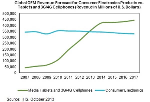Аналитики iSuppli пришли к выводу, что в этом году суммарный доход от продаж смартфонов и планшетов впервые превысит суммарный доход от продаж всех остальных устройств потребительской электроники. Как полагают специалисты по прогнозам, это свидетельствует о радикальном изменении предпочтений потребителей.