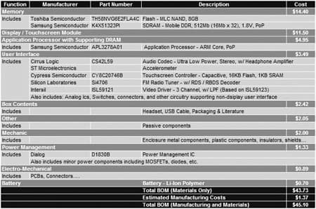 Стоимость нового для iPod nano компонента, тачскрина, относительно невелика — 11,50 долл. Флэш-память Toshiba (8 ГБ) и ОЗУ Samsung (64 МБ) вместе стоят 14,40 долл. Процессор, в котором используется архитектура ARM, произведен Samsung (возможно, на основании разработки Apple), его стоимость — 4,95 долл. Контроллер тачскрина Cypress, цифровой сигнальный процессор (DSP) Cirrus Logic, акселерометр STMicro, FM-тюнер Silicon Labs и видеоконтроллер Intersil — все эти компоненты вместе стоят 3,49 долл.
