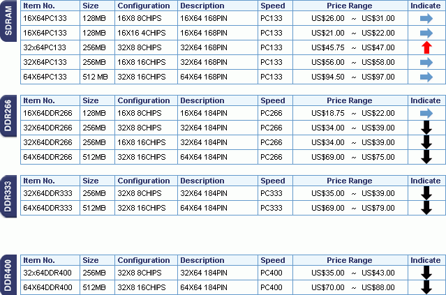 Как и предполагалось, обозреватели на спотовых рынках начали сообщать о постепенном снижении темпов роста цены SDR SDRAM – связано это с затяжным падением цен на DDR SDRAM и последними резкими "провалами" цен. Снижения же цены на SDR SDRAM пока все же ждать не приходится – по крайней мере до тех пор, пока поставки по-прежнему будут ограничены. За последние сутки отмечен рост спроса на чипы 16Mx8/8Mx16 – это объясняется из-за слишком высокой цены на чипы 4Mx16 (3,10 доллара) и дефицитом чипов 32Mx8.