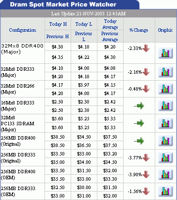 Откровенно говоря, ситуация на спотовых рынках очень сильно напоминает ситуацию, типичную для конца месяца. Особенно это заметно по памяти Samsung. Модули DDR266/333 этой компании подешевели за сутки так же сильно, как DDR400 накануне. Похоже, что следующая неделя ничем не будет отличаться от нынешней, тем более, что в силу начнет вступать реальный фактор конца месяца.