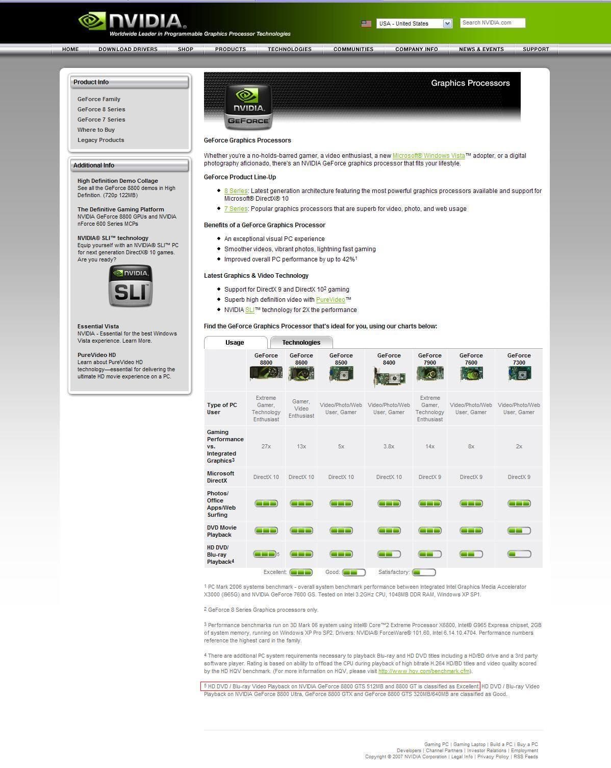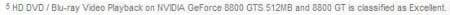 В сравнительной таблице характеристик современных графических процессоров компании появилось не слишком заметное на первый взгляд примечание, касающееся качества воспроизведения HD-видео ускорителями серии GeForce 8800. Согласно ему карты GeForce 8800GTS/GTX характеризуются оценкой "хорошо", а вот GeForce 8800GT и GeForce 8800GTS 512 MB заслуживают оценки "отлично", что и не удивительно, ведь в новый 65-нм GPU NVIDIA встроен блок аппаратного декодирования H.264 PureVideo HD VP2.