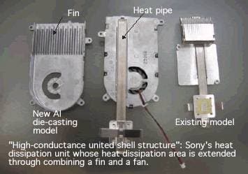 В то же время Sony, наоборот, не торопится отказываться от воздушного охлаждения и предлагает новый способ изготовления кулеров, примененный в Vaio Note VX. В этом ноутбуке применен хитрый теплоотвод с радиатором.