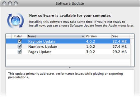В сопроводительной документации к апдейтам Apple приводит довольно скупую информацию: обновление Keynote 4.0.2 устраняет проблемы с производительностью программы во время операций воспроизведения и экспорта презентаций, а апдейты Pages 3.0.2 и Numbers 1.0.2 улучшают совместимость этих приложений с операционной системой Mac OS X.