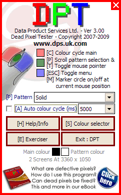 Dead Pixel Tester - небольшая бесплатная утилита, которая циклически выводит на экран различные цвета (их можно выбрать самостоятельно), чтобы вы визуально могли обнаружить "битые" (неработающие) пиксели на ваших ЖК/плазменных-мониторах.