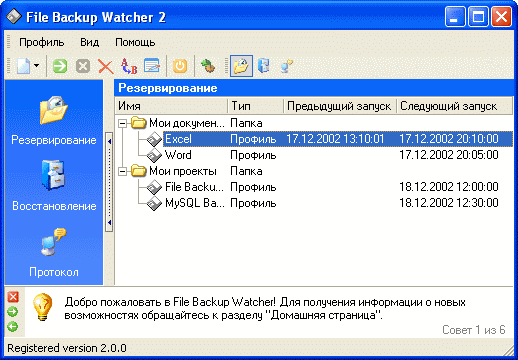 Выпущена обновленная версия программы File Backup Watcher, предназначенной для резервного копирования файлов и каталогов на локальной машине и в сети, как с последующей их архивацией, так и без нее. В программе имеются мастера создания профилей и настроек ZIP-архивирования, планировщик задач и система фильтров. Резервирование может осуществляться по одному из трех методов (Full, Icremental и Update) на floppy/ZIP дискеты, жесткий диск и CD-RW.