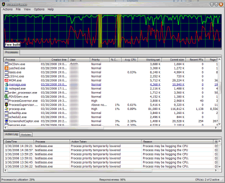 Обновилась Process Lasso, небольшая утилита для операционных систем Windows NT/2000/XP/2003 32/64-bits, которая позволяет вручную или автоматически манипулировать процессами, запущенными на вашем компьютере для достижения максимального быстродействия и стабильности. Имеется возможность отключения процессов, полностью загружающих процессор, имеется возможность создавать списки разрешенных и запрещенных к запуску процессов, ведется детальный логгинг всех процессов. При необходимости можно купить Pro-версию, в которой отсутствуют ограничение на количество поддерживаемых процессов (в бесплатной версии их всего три).