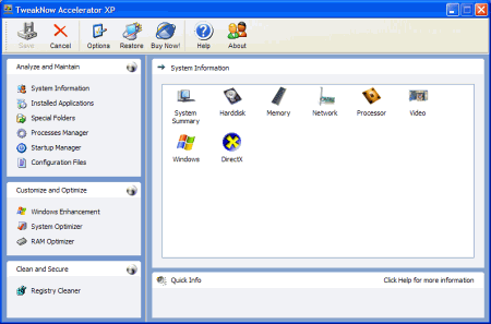 Обновилась небольшая утилита TweakNow Accelerator XP, служащая для настройки операционных систем Windows XP. Программа позволяет повысить быстродействие ОС, улучшить защиту, отключив ненужные модули, отображает информацию обо всех установленных программах и аппаратном обеспечении, помогает управляться с конфигурационными файлами и автозагрузкой. Кроме того, Accelerator XP оптимизирует систему и память, чистит реестр.