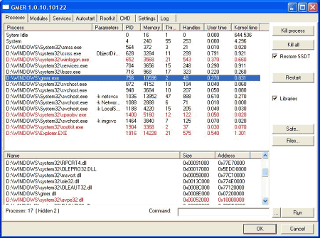 GMER - небольшая бесплатная утилита, которая предназначена для работу с руткитами: отображает скрытые процессы и сервисы, выводит список скрытых файлов, ключей реестра и драйверов. Кроме того, GMER осуществляет мониторинг создания процессов, загрузки драйверов и библиотек, использования файлов, изменений реестра, активность TCP/IP-соединений.