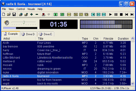 VUPlayer - бесплатный аудиоплеер, поддерживающий работу со следующими музыкальными форматами: Sound/Noise/ProTracker, MultiTracker, ScreamTracker, FastTracker, ImpulseTracker, MO3 Packer, MPEG Audio, QuickTime MPEG-4 (AAC/Apple Lossless), Musepack, Ogg Vorbis, Free Lossless Audio Codec, Monkey's Audio, WavPack, Audio Interchange File Format, Windows Media Audio, Windows PCM/ACM и Audio CD. Также VUPlayer умеет обращаться потоковыми MP3/OGG, имеет графический эквалайзер, управление громкостью, балансом и т.д., минимизируется в трей, управляется при помощи "горячих" клавиш, поддерживает работу с визуальными плагинами, кодирует музыку в форматы Ogg Vorbis, FLAC, APE, WMA & WV, общается с базами freedb.