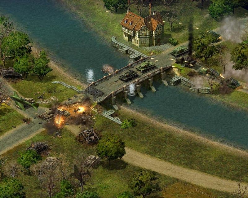 Германия, 1945. Немецкие «Королевские Тигры» и поддерживающие их силы защищают мост от атаки советских танков и «Катюш».