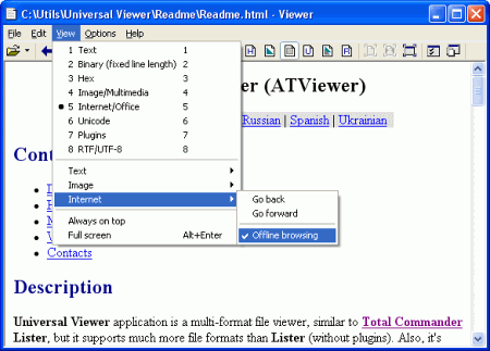 Universal Viewer (ATViewer) - это универсальный файловый просмотрщик с большим набором поддерживаемых форматов. Доступны следующие режимы просмотра файлов: