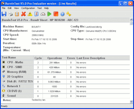Обновилась PassMark BurnInTest, программа для тестирования различных подсистем компьютера в экстремальных условия. BurnInTest тестирует работу процессора, жестких дисков, CD/DVD-приводов (в том числе и записывающих), звуковых карт и видеокарт, памяти, сетевых соединения, принтеров и т.д. Pro-версия позволяет также тестировать работу ленточных накопителей, USB-устройств, параллельных и последовательных портов.