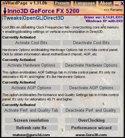 Умельцы с сайта Guru3D изготовили новую версию утилиты nVHardPage, которая предназначена для изменения практических всех настроек (в том числе и скрытых) в драйверах Detonator от компании NVIDIA. При помощи nVHardPage вы сможете покопаться в параметрах Control Panel, Direct3D и OpenGL, а также осуществить разгон своей видеокарты. Поддерживаются все карточки от TNT до GeForce FX и практически все версии Detonator.