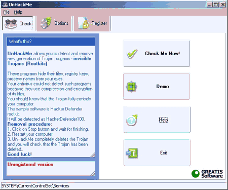 UnHackMe - антивирус для обнаружения и эффективного удаления новых поколений троянов, использующих технологию руткит (то есть скрывающих все следы своего пребывания на компьютере жертвы).