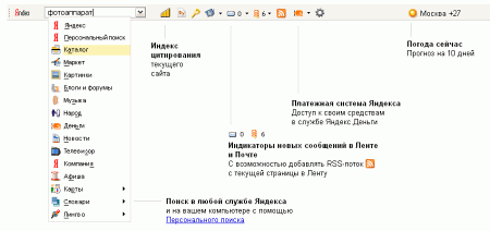 Помимо поиска, у Яндекс.Бара для Firefox есть целый ряд удобных функций для доступа к различным службам Яндекса. Это - поиск перевода или определения выделенного на странице слова, сохранение закладок пользователя на сервисе Яндекс.Закладки, уведомление о новых письмах в Яндекс.Почте и сообщениях в Яндекс.Ленте, добавление RSS-потоков с просматриваемого сайта в Ленту. Кроме того, Бар может предоставлять информацию о вашем счете в Яндекс.Деньгах и о погоде в любом количестве городов одновременно.