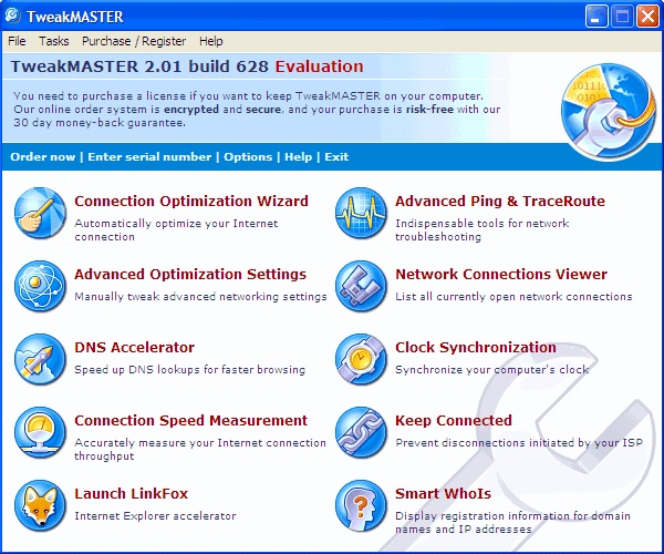 Программа TweakMASTER служит для оптимизации сетевых соединений и фактически представляет собой набор из четырех утилит, настраивающих различные параметры Интернет и интранет соединений на максимальное быстродействие. Поддерживается работа с Dial-Up, DSL, Cable или Wireless соединениями. Имеется автоматическая настройка, которая осуществляет по различным оптимизационным стратегиями. Имеется DNS Accelerator, утилита подсчета скорости передачи данных, синхронизатор часов по всемирному времени, Advanced Ping and Traceroute, Network Connections Viewer, Smart WhoIs и т.д.