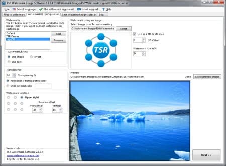 TSR Watermark Image - небольшая, бесплатная (для частного использования) программа, которая позволяет устанавливать цифровые водяные знаки на любые картинки, фотографии и изображения. При необходимости утилита позволяет изменить размер оригинального снимка. В качестве "водяного знака" можно использовать текст или другое изображение с выбранным цветом и уровнем прозрачности. TSR Watermark Image проста в использовании и не так громоздка, как старшие коллеги, хотя и имеет порядочный набор возможностей. Имеется русский интерфейс.