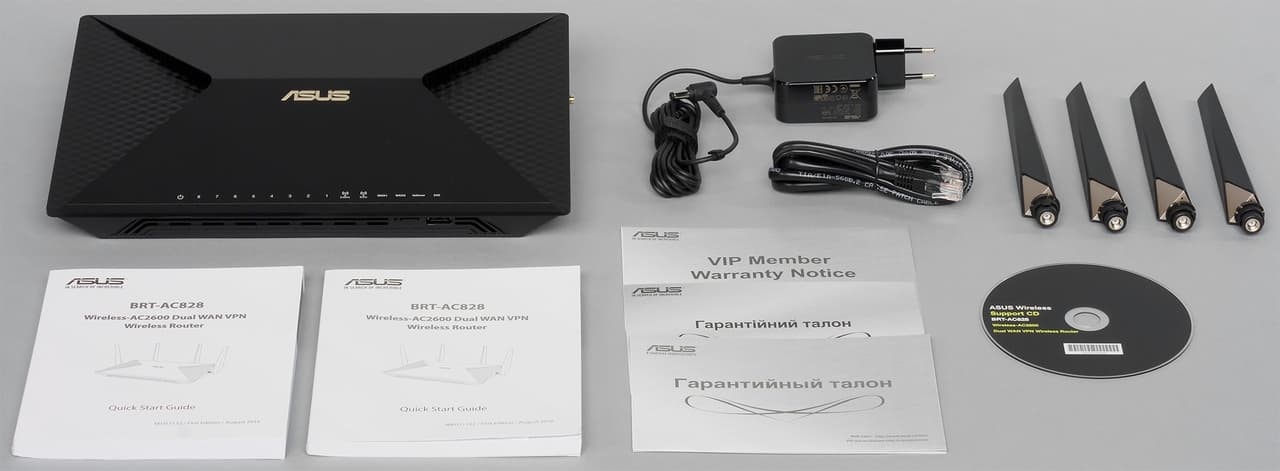 В комплект поставки роутера входят: блок питания, четыре съемные антенны, сетевой патч-корд, комплект документации, компакт-диск с программным обеспечением, гарантийный талон, карточка регистрации VIP-клуба. Блок питания «розеточного» формата, кабель имеет длину более 2,2 метра и оборудован «липучкой» для крепления. Параметры блока питания характерны скорее для ноутбуков — 19 В 2,37 А, а помочь эффективно передать такую мощность поможет «толстым» штекер. Учитывая конфигурацию сетевых портов, хотелось бы видеть в комплекте более одного сетевого кабеля.