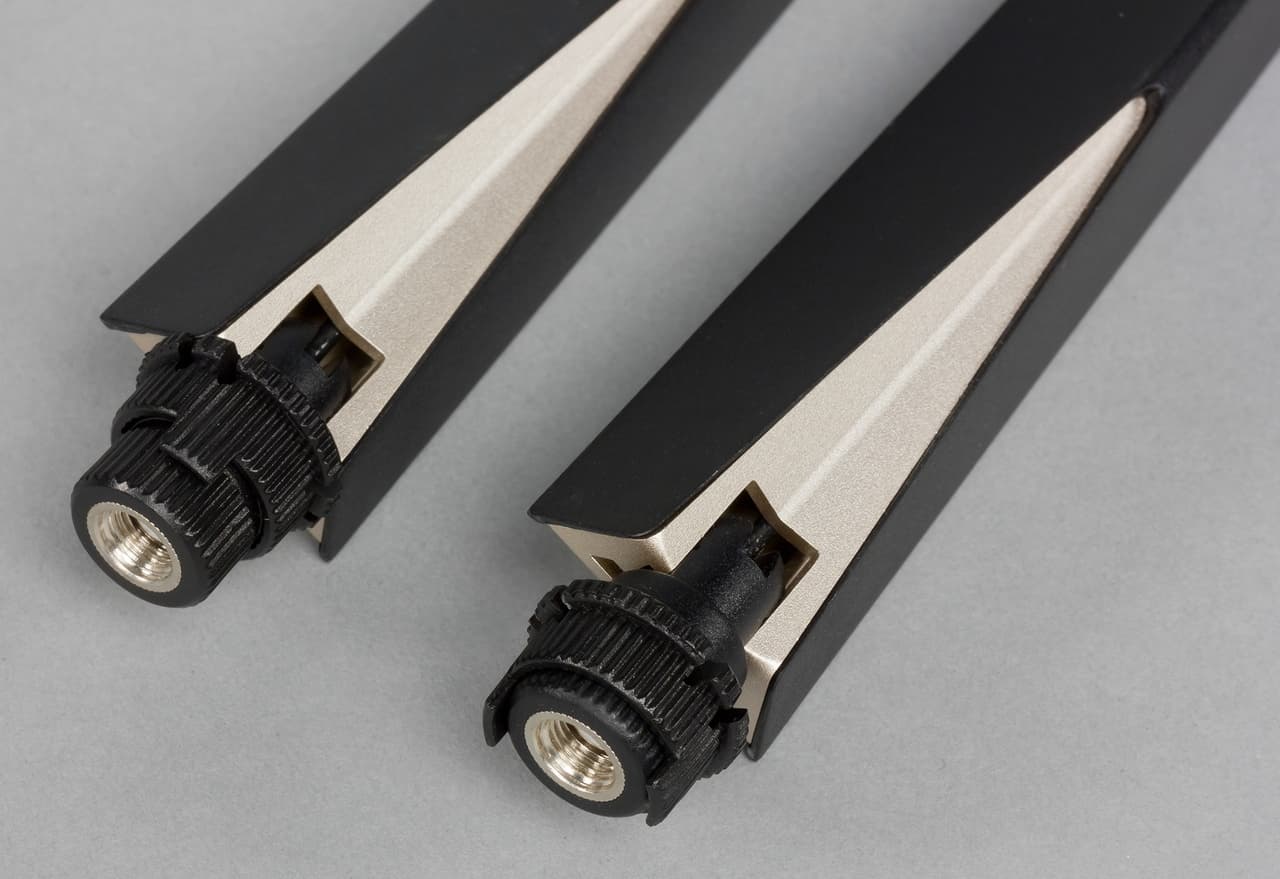 Антенны устанавливаются на боковых сторонах и сзади. В этой модели компания использовала специальную конструкцию разъемов с оригинальной защелкой. Это исключает такую часто встречающуюся проблему, как откручивание антенн при попытке регулировки их положения. Общая длина антенн составляет 166 мм, длина подвижной части — 152 мм.