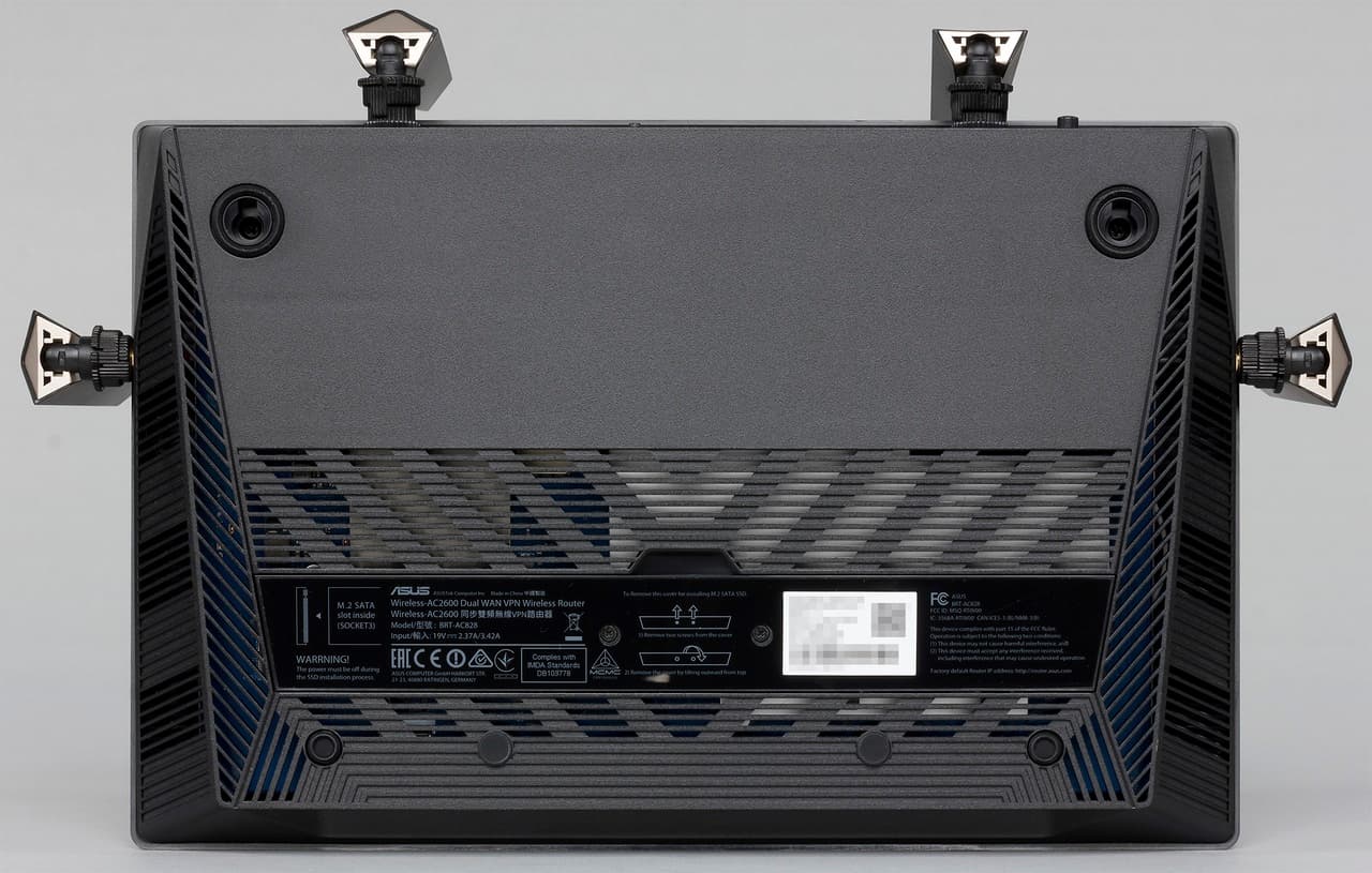 Роутер оборудован двумя портами USB 3.0. Один находится сзади, а второй на переднем торце. Около разъемов присутствуют индикаторы активности и кнопки для безопасного отключения. Кроме того, на дне корпуса роутера есть закрытый на два винта отсек, предназначенный для установки SATA-накопителя формата M.2 (на выбор — 2242, 2260, 2280).