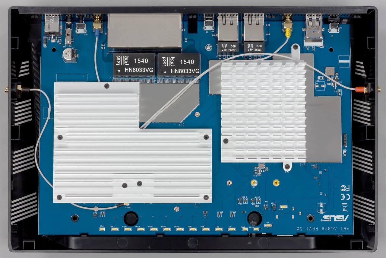 Все основные микросхемы на верхней стороне печатной платы закрыты экранами — в частности два радиоблока, сетевой коммутатор, трансиверы портов WAN и основной процессор с оперативной и флэш-памятью. Дополнительно на них установлена пара алюминиевых радиаторов. С обратной стороны есть только экран напротив процессора и алюминиевая пластина под радиоблоками.