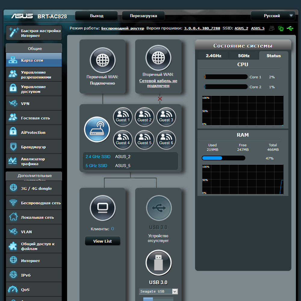 Для тех, кто ранее имел дело с роутерами Asus, разобраться будет несложно. Тем более что интерфейс имеет переводы на несколько языков, включая русский. В верхней части окна находятся кнопки выхода и перезагрузки. Под ними информационная строка с режимом работы, версией прошивки, именами беспроводных сетей. Причем с текста идут ссылки на соответствующие страницы настроек. Справа — значки статуса гостевой беспроводной сети, подключения к интернету и наличия USB-устройств. В левой части окна идет основное меню. В нижней части страницы представлены ссылки на информационные материалы и раздел поддержки. При первом включении, после сброса настроек или по желанию, можно воспользоваться мастером настройки.
