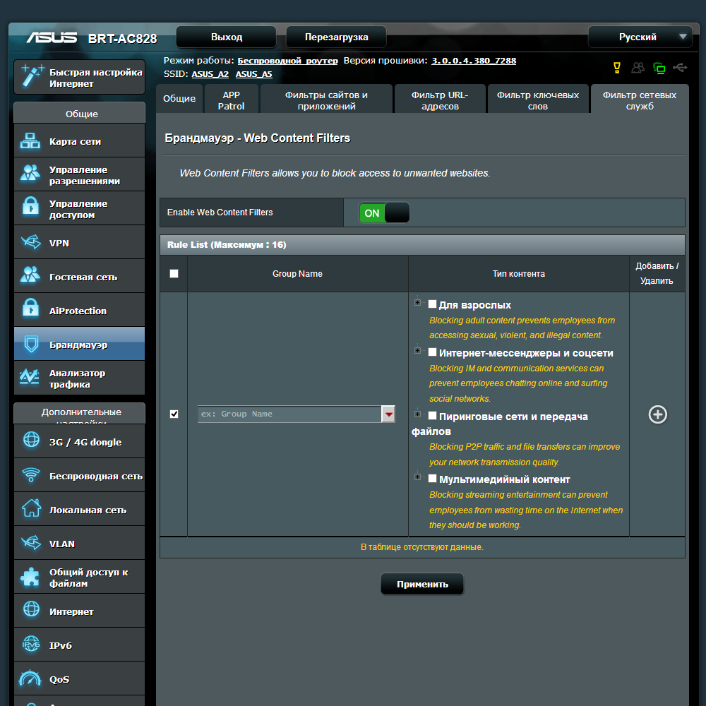 Функции межсетевого экрана в данной модели были расширены. В дополнение к привычным фильтрам сетевых служб и ссылок, появилась возможность для групп хостов блокировать работу с определенными сервисами и приложениями по категориям. Список их невелик и не имеет возможности редактирования, но может быть полезен в некоторых случаях. В частности в нем есть такие группы как «Для взрослых», «интернет-мессенджеры и социальные сети», «Пиринговые сети и передача файлов» и «Мультимедийный контент». При попытке зайти на такие сайты отображается страница с информацией о блокировке. Непереведенная страница «App Patrol» имеет сходные возможности, но, вероятно, ориентирована больше на контроль трафика на низком уровне.