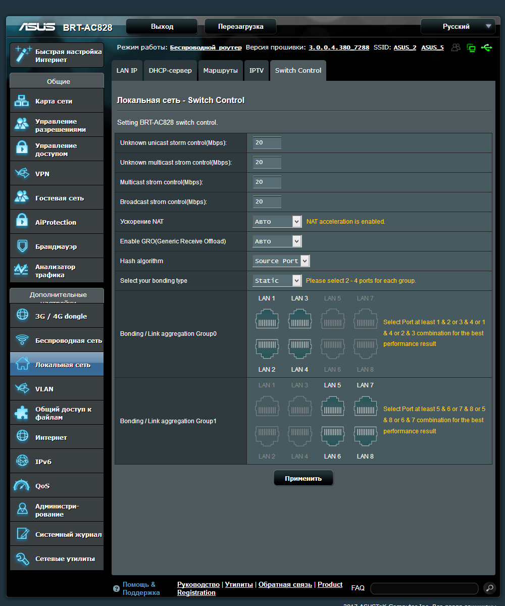 На странице «Локальная сеть» интерес представляет возможность настройки режимов объединения портов (включая 802.3ad). Всего роутер поддерживает до двух групп, в каждую из которых может входить до четырех сетевых портов сегмента LAN. Все остальное обычно — выбор собственного адреса роутера, настройка сервера DHCP, маршрутов и сервиса IPTV.