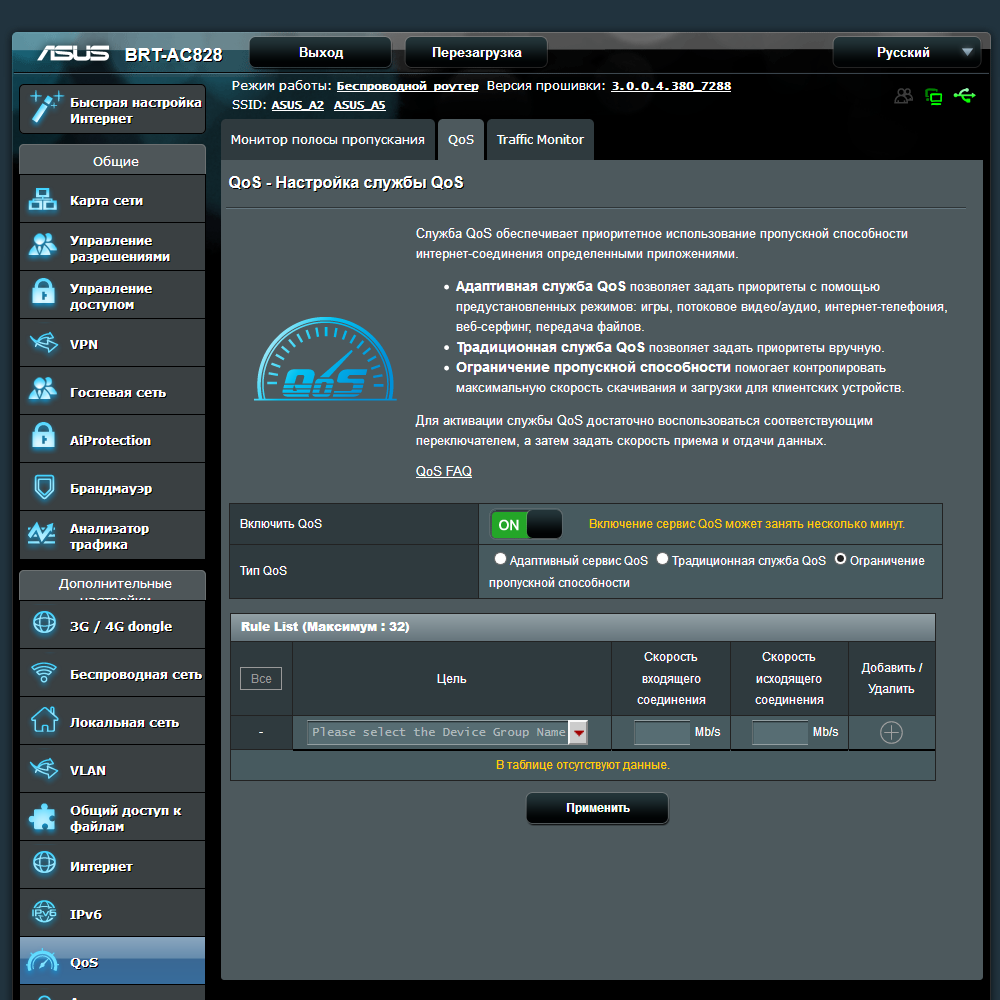 Функция контроля трафика QoS имеет три режима работы: автоматический (адаптивный), традиционный (с установкой приоритетов) и ограничения скоростей загрузки и отдачи клиентам по IP-адресам. Также присутствует страница с монитором текущего трафика.