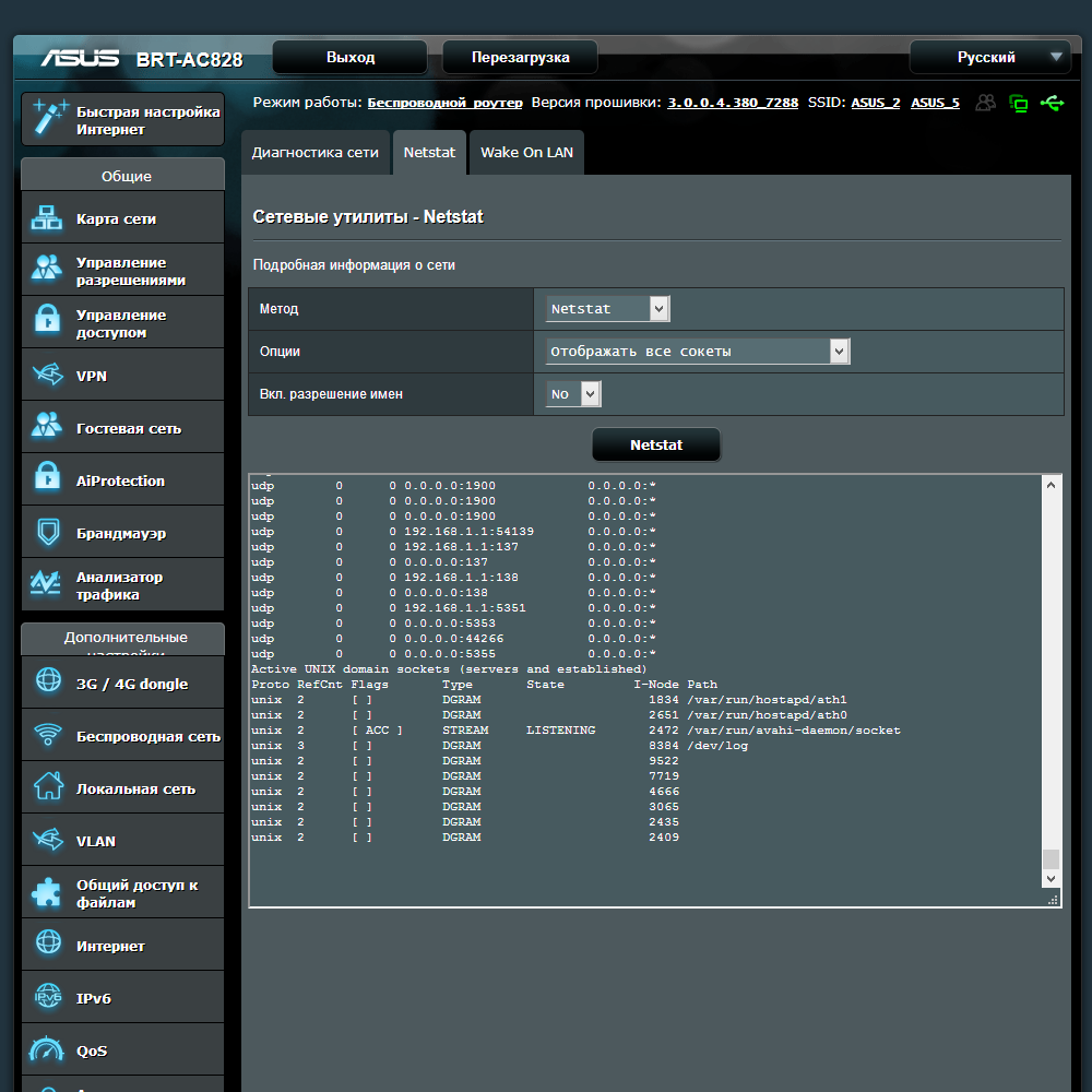 Завершает список страниц интерфейса пункт «Сетевые утилиты», где представлены знакомые программы ping, traceroute, nslookup, netstat и функция WOL. Последняя поддерживает предварительное составление списка требуемых систем с именами и MAC-адресами. Причем клиентов можно вбивать в ручном режиме или выбирать из списка уже знакомых роутеру.