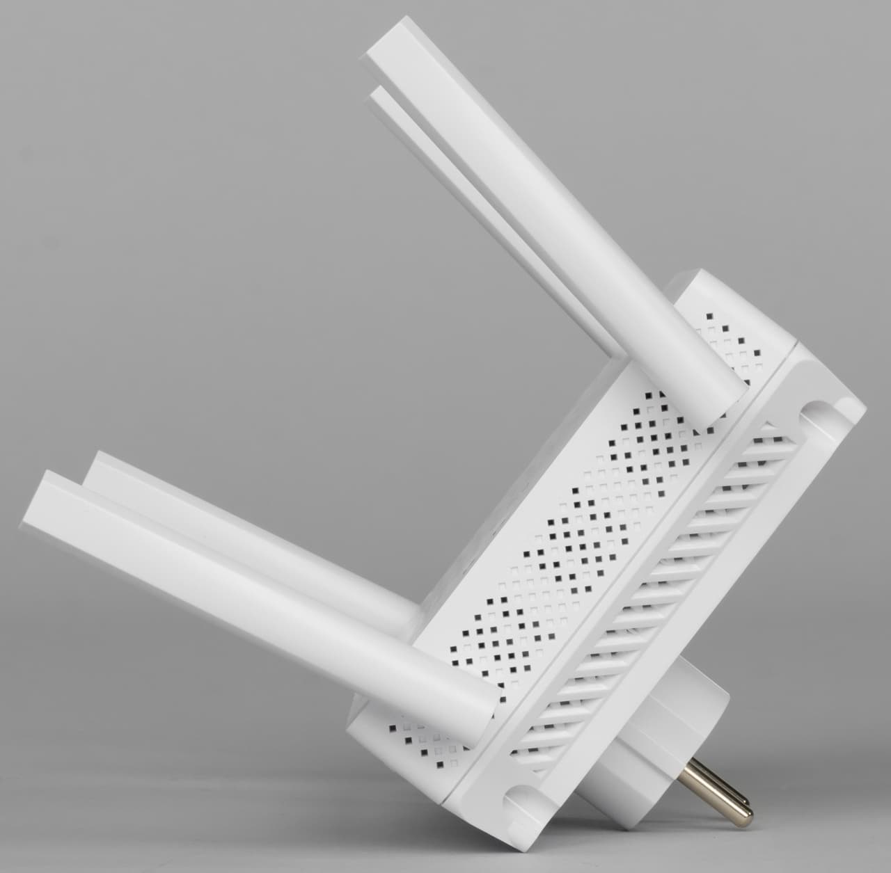Четыре антенны располагаются по две на боковых торцах устройства. В данной модели они несъемные, имеют две степени свободы и относительно небольшие (около 10 см). С задней стороны установлена евровилка, которая также удерживает повторитель на месте установки. Заметим, что она может поворачиваться на 90 градусов, так что не будет проблемы выбрать подходящий вариант ориентации корпуса. Однако надо понимать, что соседние розетки, если они есть, могут быть заблокированы. Кроме того, желательно заранее оценить совместимость с вашими моделями розеток.