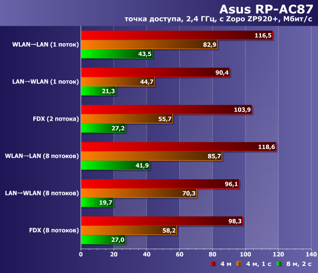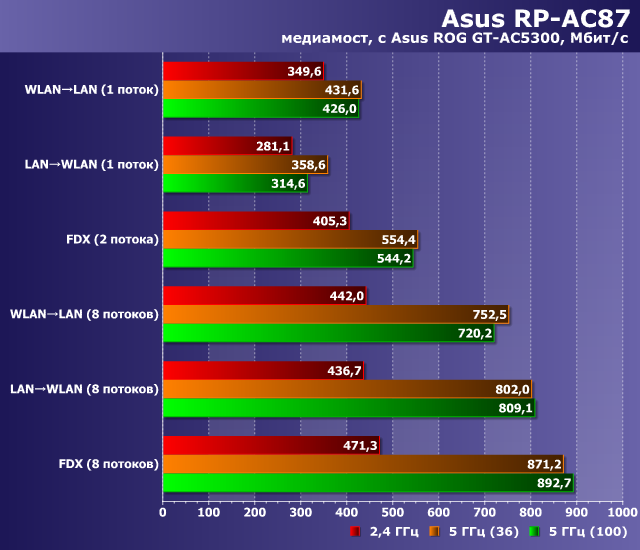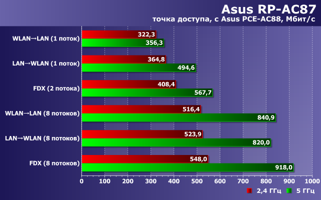 Как мы уже писали выше, работать в 2,4 ГГц на этой паре оборудования смысла нет. Но цифры мы все-таки получили: клиент через мост может получать от 280 Мбит/с в один поток до 440 Мбит/с в многопоточном режиме. Давно мы не видели таких высоких значений для диапазона 2,4 ГГц! Впрочем, у большинства «простых» клиентов антенн все-таки меньше, так что их показатели будут в три-четыре раза ниже. Найти устройство с одним диапазоном и «сильным» адаптером 802.11n в нем было сложно всегда, а уж с появлением и распространением 802.11ac этому режиму работы большинство производителей вполне ожидаемо не уделяют большого внимания. Хотя результаты тестов в 5 ГГц сложно назвать поводом для этого. Если скорость 300+ Мбит/с в один поток мало отличается от 2,4 ГГц, то 800 Мбит/с в многопоточном режиме — это в два раза больше. Так что если вы купили 4К-телевизор и хотите использовать его без проводов для просмотра высокобитрейтного видео — Asus RP-AC87 сможет вам помочь. Но, конечно, потребуется и соответствующий роутер.