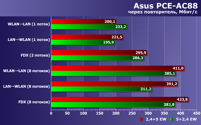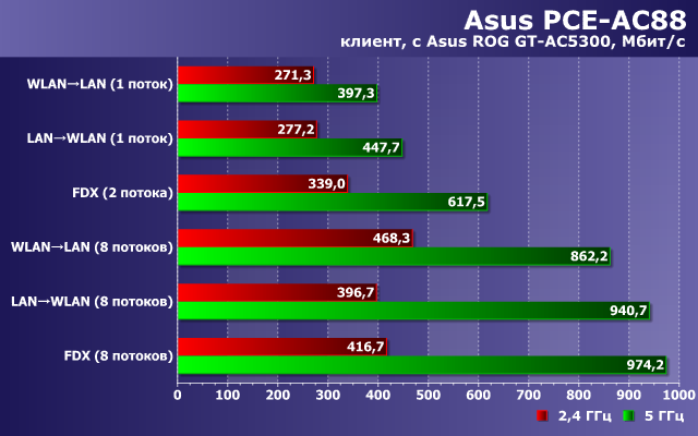 Запомним, что для этой пары в 2,4 ГГц можно получить 270—470 Мбит/с в зависимости от шаблона, а в 5 ГГц — от 400 до 970 Мбит/с.