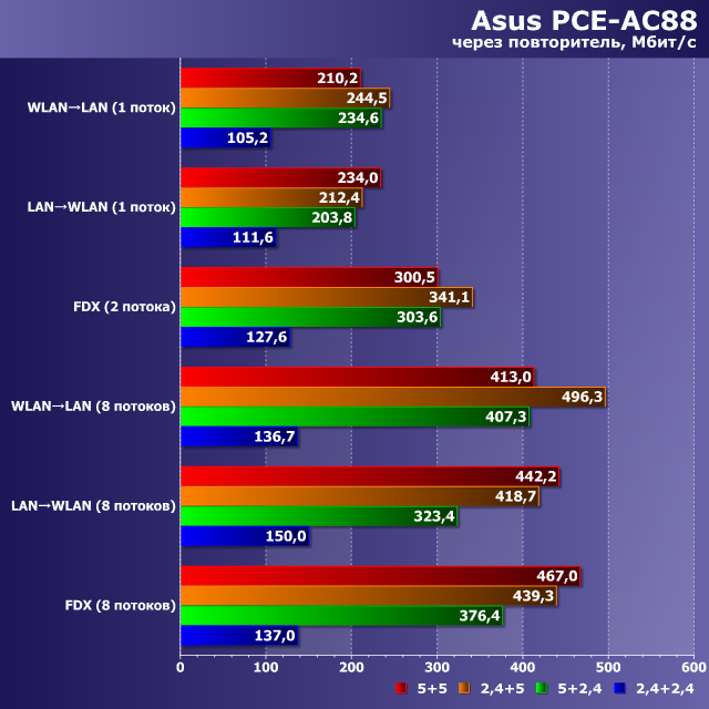 Самая интересная комбинация — это, конечно, 5+5 ГГц. Здесь мы видим практически полное соответствие теории: скорость при работе через повторитель ниже в 1,9-2,1 раза. В итоге клиент может рассчитывать на 210—470 Мбит/с, что, безусловно, впечатляет. Да, это значительно ниже, чем при прямом подключении, но все-таки для большинства распространенных задач это высокие показатели. А вот связка 2,4+2,4 ГГц оказалась медленнее прямого подключения в 2,5-3,4 раза, так что итоговая скорость — от 110 до 140 Мбит/с. Напомним еще раз, что если на клиенте используется более простой беспроводной адаптер (как это обычно бывает), скорость его работы будет ниже. «Смешанные» комбинации показывают средние результаты между «чистыми», а скорость варьируется от 200 до 500 Мбит/с.