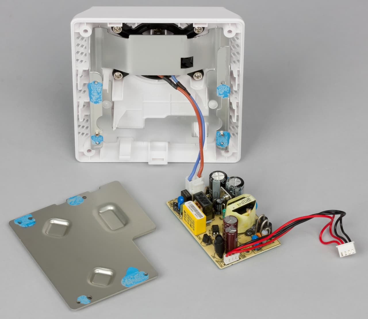 В нижней части корпуса расположен блок питания. Модуль с поворотной вилкой закрыт металлической пластиной, выполняющей роль внутренней рамы и дополнительного радиатора. Непосредственно плата блока питания относительно крупная, что не удивительно, учитывая потребление мощной начинки.