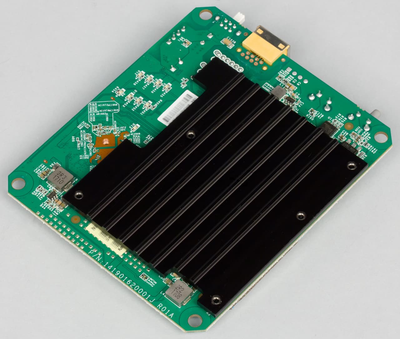 Заметим, что здесь есть и второй небольшой радиатор, непосредственно контактирующий с процессором. На плате можно заметить контактные площадки консольного порта. Антенны подключаются через микроразъемы. Монтаж аккуратный, замечаний к нему нет.