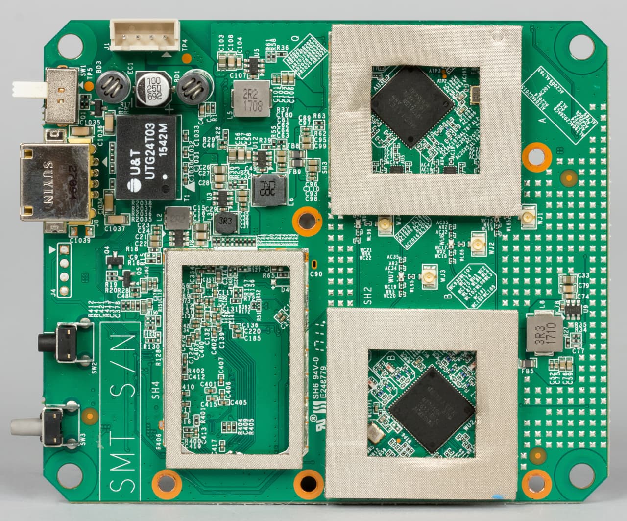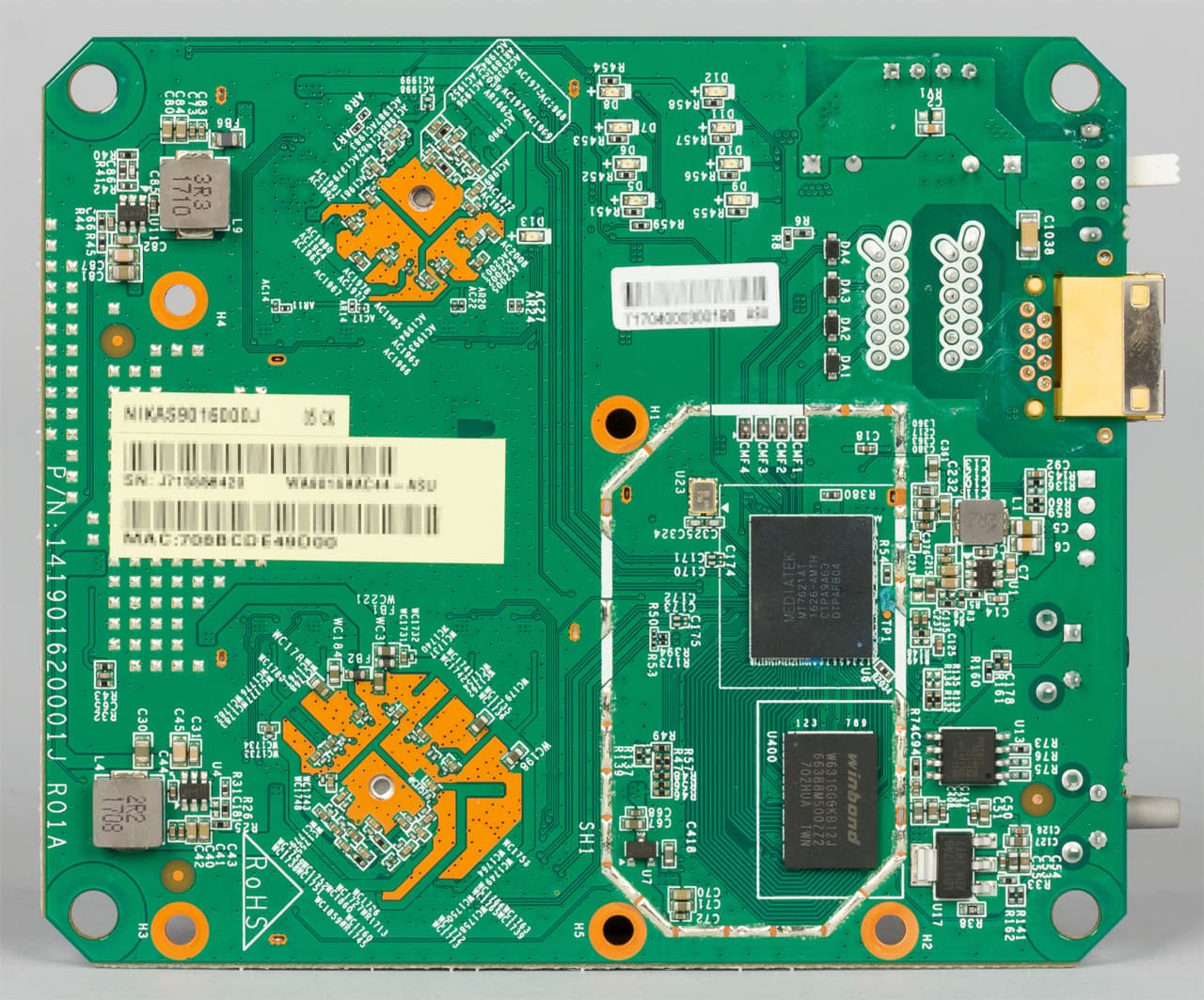 С одной стороны основной печатной платы находятся два чипа радио, цепи питания, кнопки и элементы обеспечения работы проводного порта. С обратной мы видим центральный процессор, чипы оперативной и флэш-памяти, а также еще немного деталей подсистемы питания.