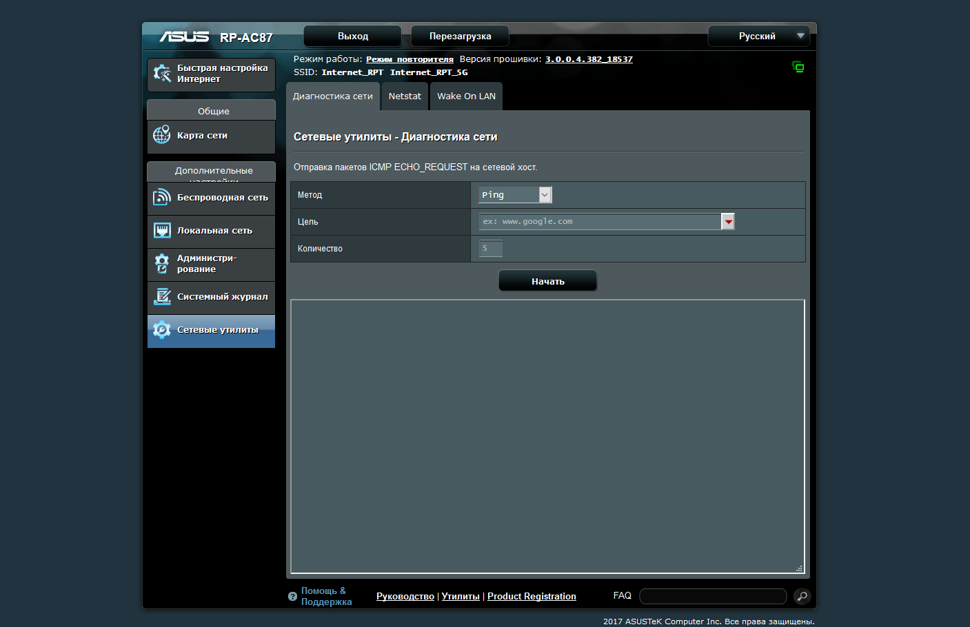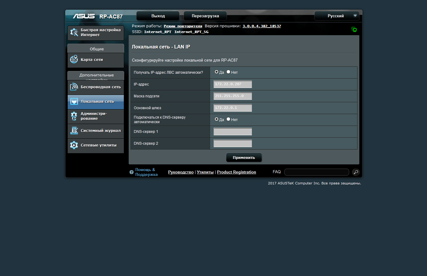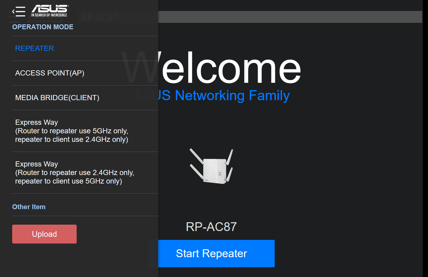 Учитывая, что Asus RP-AC87 поддерживает разные варианты использования, мы проверили с ним несколько сценариев. Начнем с режима точки доступа. В этом случае устройство подключается кабелем к существующей беспроводной сети и раздает Wi-Fi сразу в двух диапазонах.