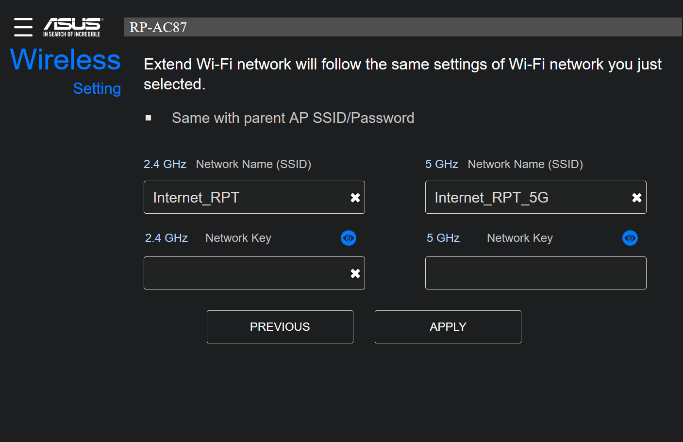 Попробуем для начала современный мобильный вариант. Программа при первом запуске ищет беспроводную сеть экстендера (ASUS_RPAC87 или, если смартфон поддерживает диапазон 5 ГГц, ASUS_RPAC87_5G) и предлагает настроить это устройство.