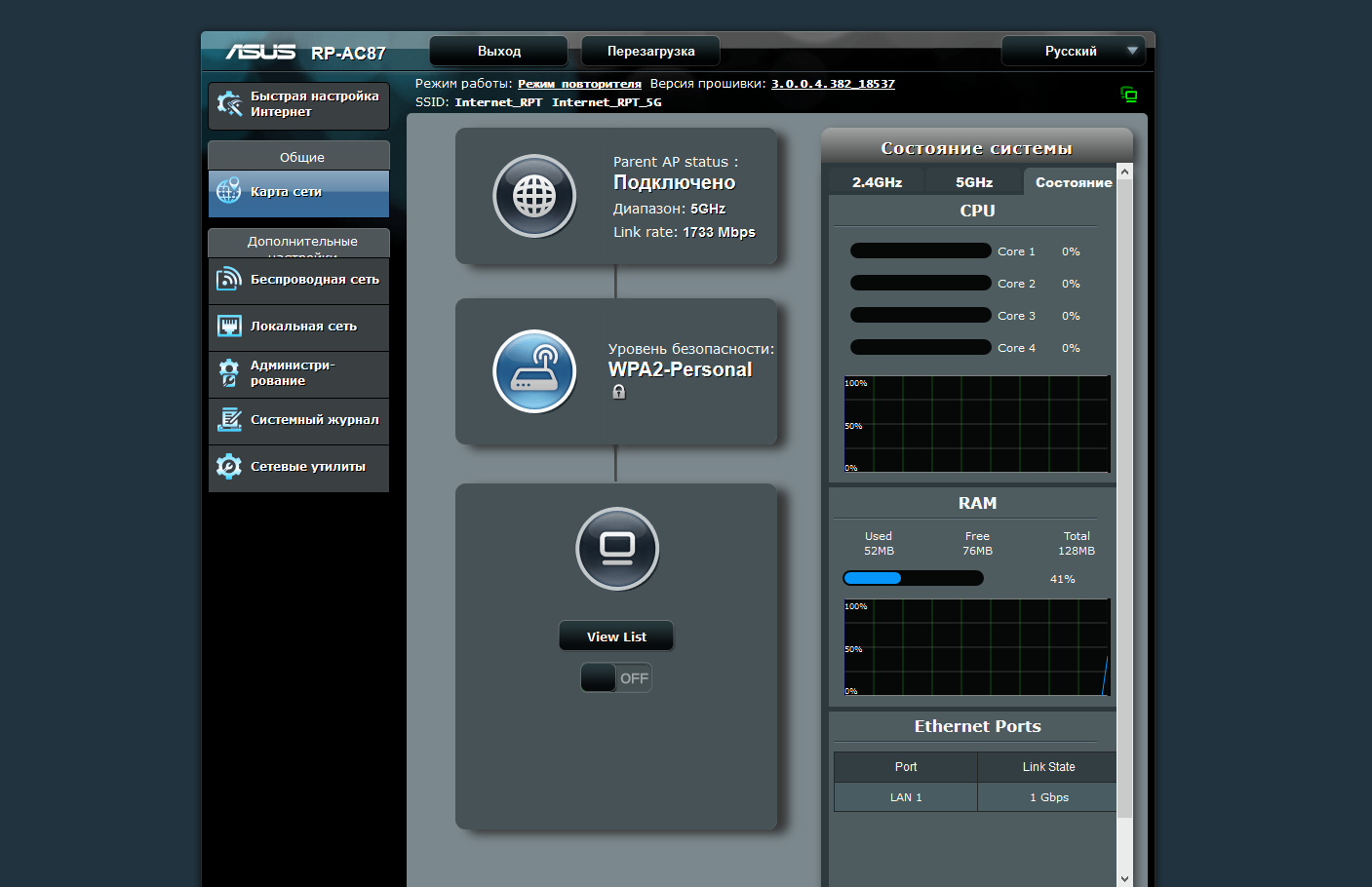 Основная страница — карта сети, где можно посмотреть текущее состояние подключения к основному роутеру, клиентов, загрузку процессора и другую информацию.
