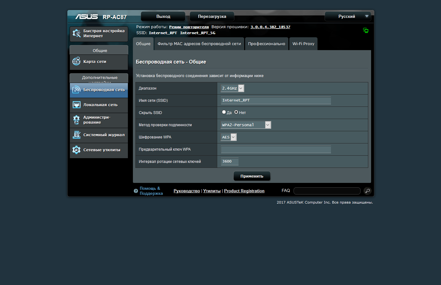 Раздел «Беспроводные сети» отвечает за настройку собственных сетей повторителя — имена, каналы, защита и так далее.