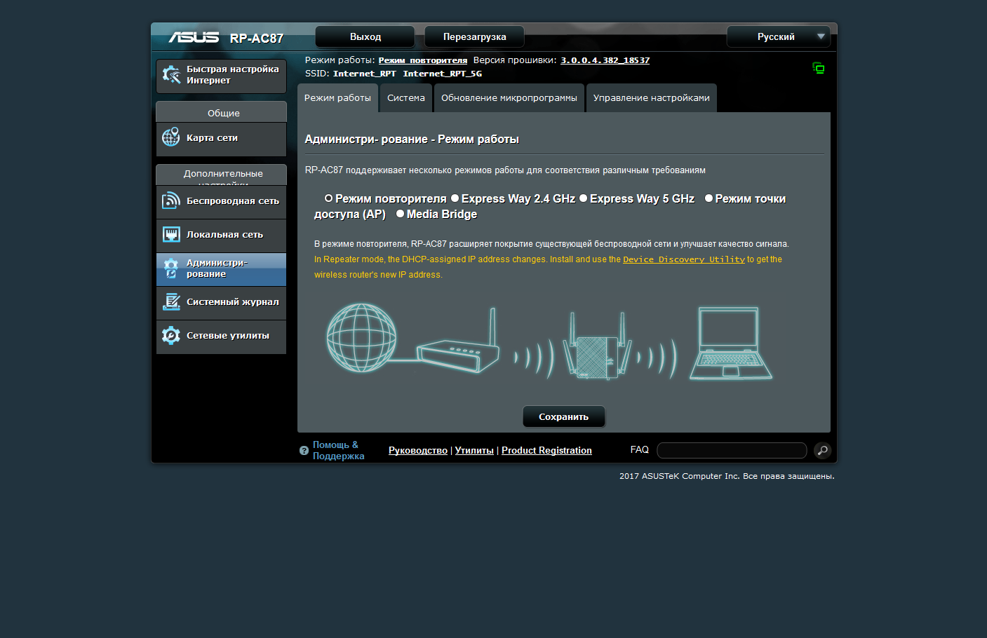 В случае, если вы начинаете с веб-интерфейса, то в нем также предусмотрен мастер первой настройки, поддерживающий все имеющиеся режимы. На выбор предлагаются варианты повторителя, точки доступа, медиамоста и два варианта Express Way. В последнем случае речь идет о жестком выборе разных частотных диапазонов для подключения между роутером и репитером и репитером и клиентами, что позволяет обеспечить более высокую скорость. Во время настройки предлагается выбрать сеть, к которой подключаться, имена и пароли собственных сетей повторителя, а также имя и пароль администратора.