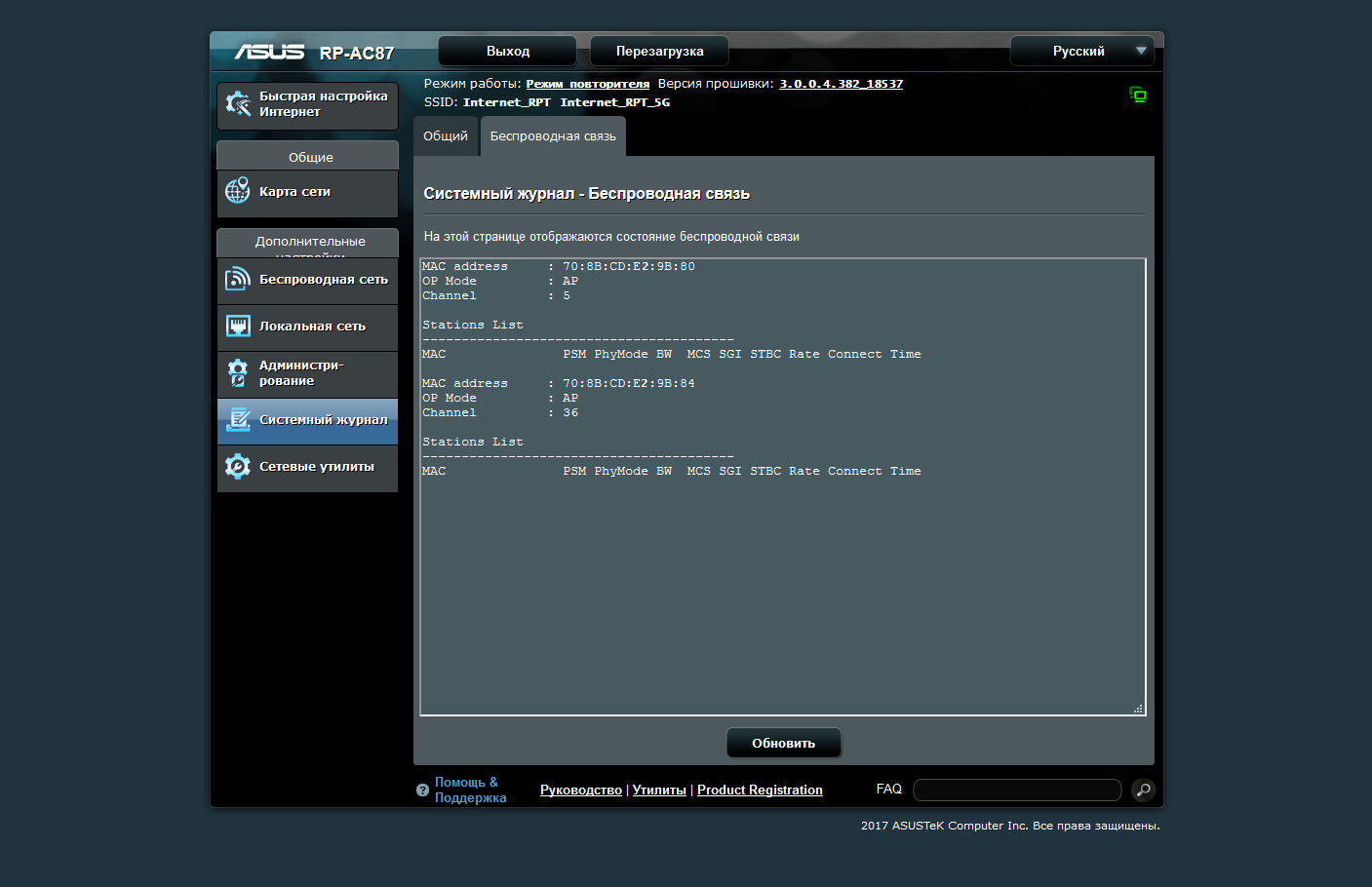 На второй странице группы «Системного журнала» можно посмотреть текущие подключения клиентов к Wi-Fi, например, для проверки их скорости.