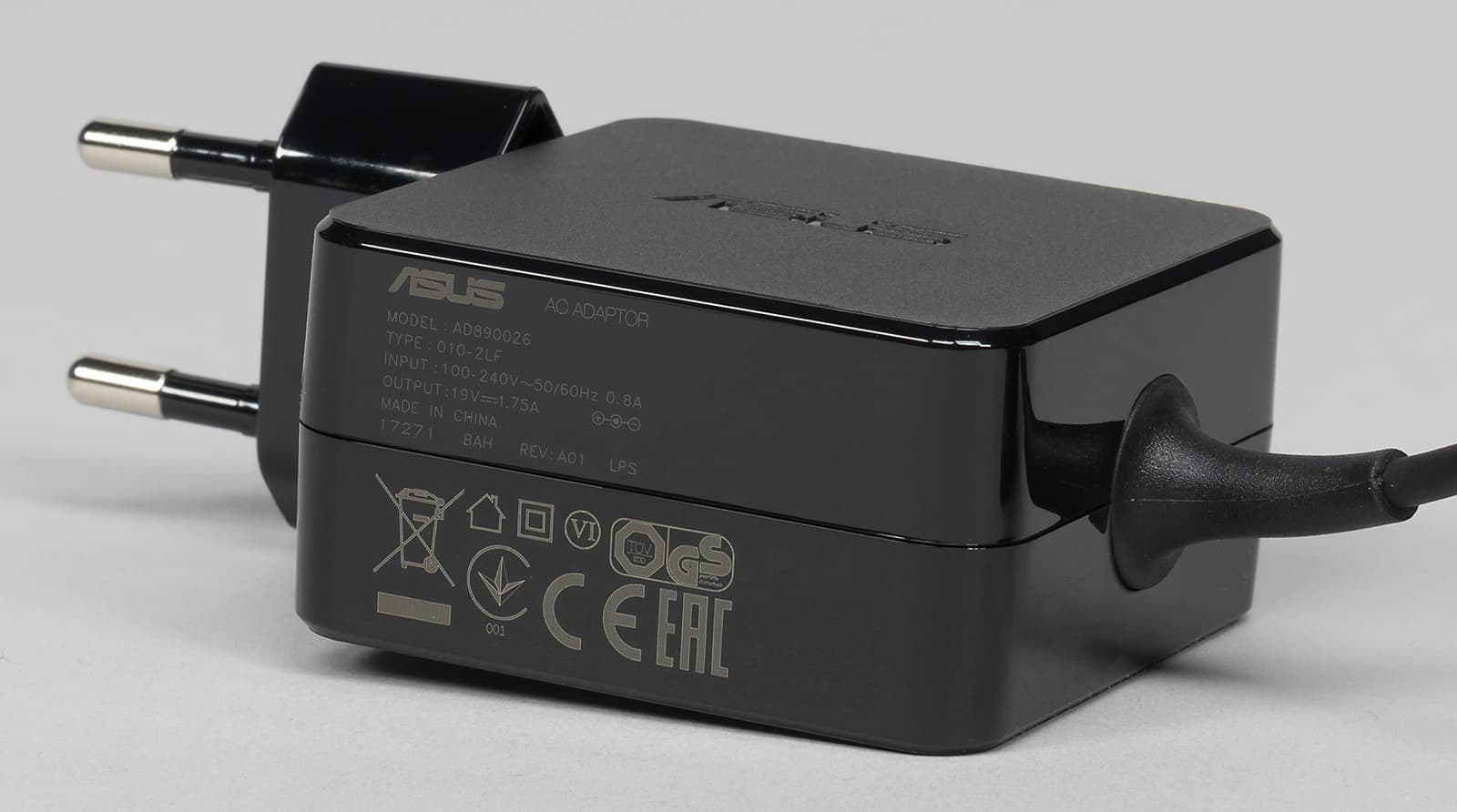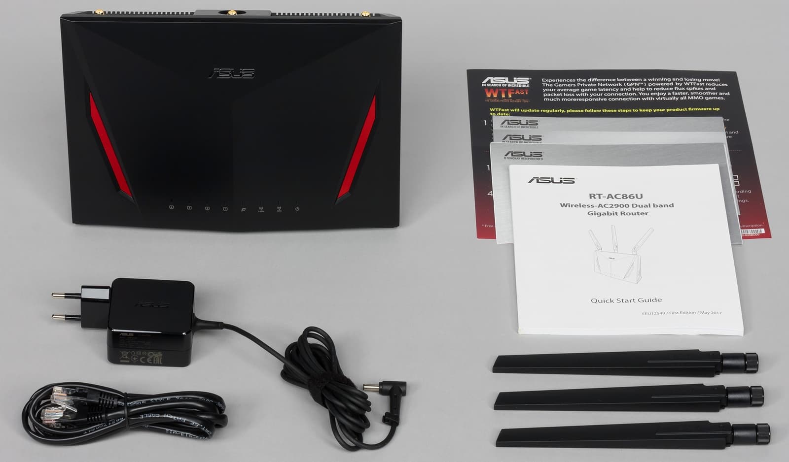 В комплект поставки роутера входят блок питания, три съемные антенны, сетевой патч-корд, печатное краткое руководство по началу работы на нескольких языках, включая русский, а также несколько листовок (гарантийный талон, регистрация VIP, описание функции WTFast). Блок питания небольшой, выполнен в «розеточном» формате и имеет параметры 19 В 1,75 А. Кабель от блока питания имеет липучку, что удобно.