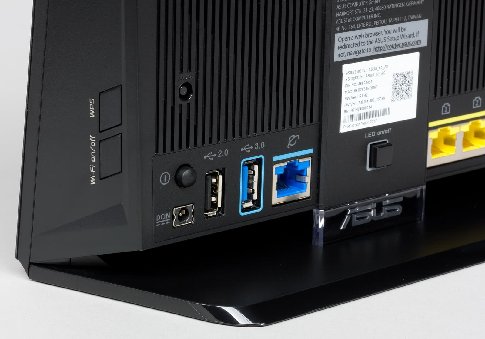 Все подключения и остальные органы управления находятся сзади. Здесь мы видим: скрытую кнопку сброса настроек, вход блока питания с выключателем, порты USB 2.0 и USB 3.0, порт WAN и четыре порта LAN (все без индикаторов — они есть на передней панели, но скорость подключения клиента по ним не узнать). Кроме того, здесь есть кнопка для отключения всех светодиодов. Отметим наличие прозрачной вставки с логотипом компании, которая у некоторых прежних моделей подсвечивалась. В новинке такой функции нет.