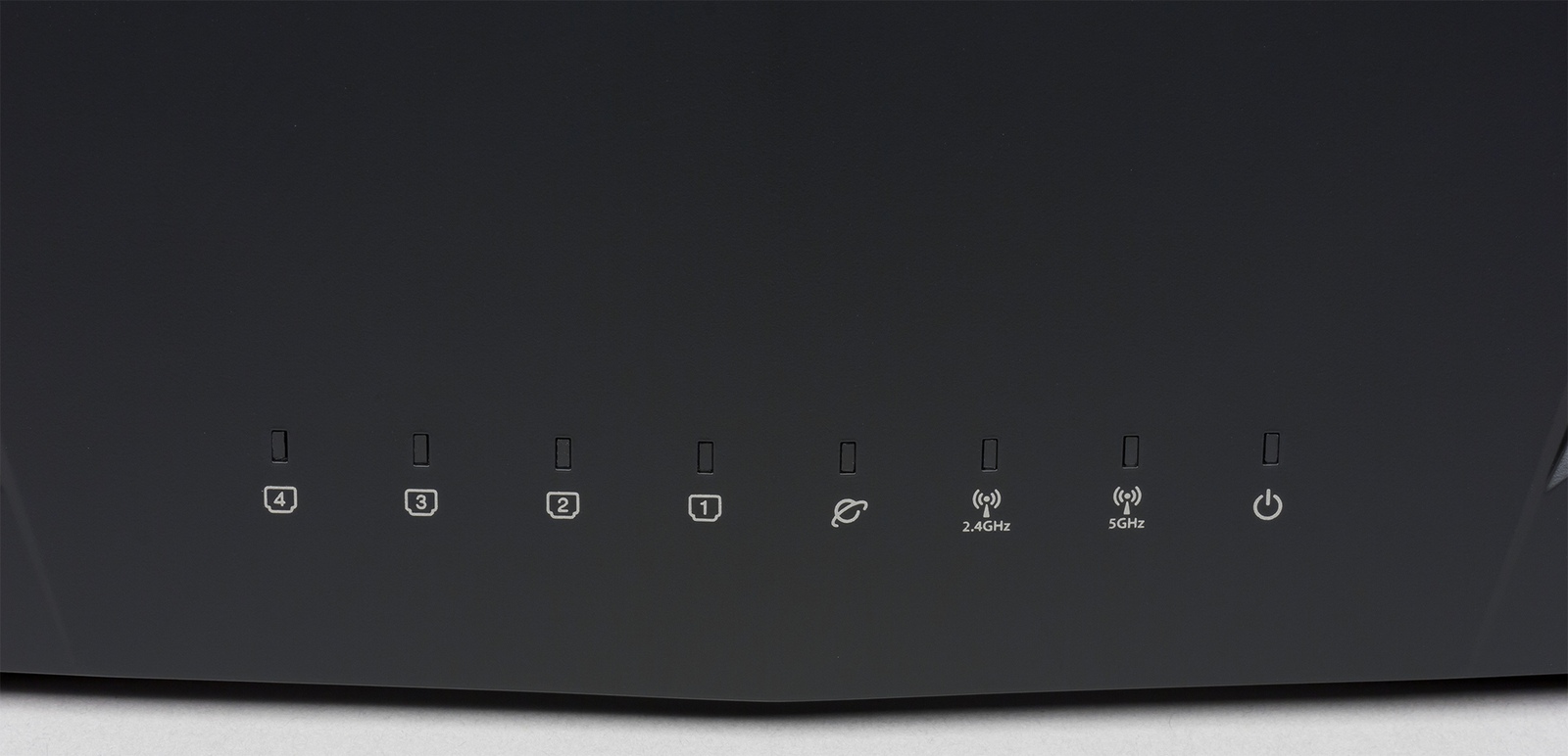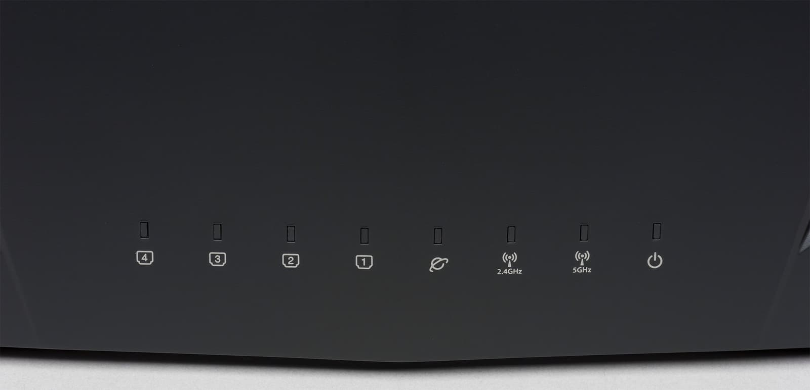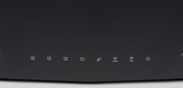 В нижней части панели мы видим восемь индикаторов прямоугольной формы. Большинство используют спокойный белый цвет, но некоторые также могут гореть красным в случае проблем (например, при отсутствии подключения к интернету). Индикаторы для интерфейсов WAN, LAN и Wi-Fi мигают при активном обмене данными.