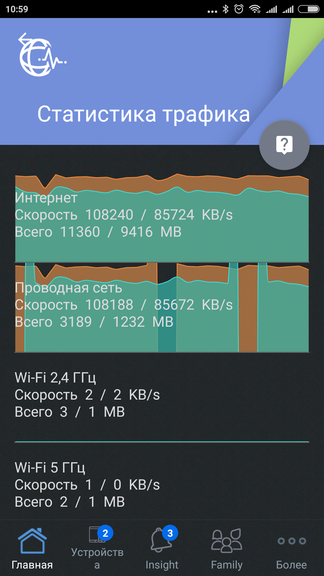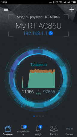На основном экране программы отображается модель и имя роутера, а также текущая нагрузка на интернет-канал и несколько иконок меню. Если коснуться первого пункта, то на экран будет выведена информация по модели, прошивке, режиму работы, адресам и другие данные о роутере. После касания графика можно будет посмотреть более подробную информацию по трафику по интерфейсам — интернет, проводная сеть, точки доступа.