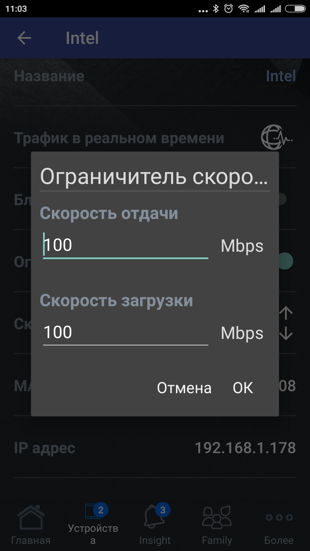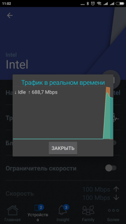 Пункт меню «Устройства» покажет вам текущий список клиентов с типом подключения и IP-адресами. Из него можно перейти в параметры настройки каждого устройства, где можно посмотреть именно его трафик, блокировать доступ к интернету, ограничить скорости приема и передачи, а также переименовать клиента. Отметим, что все операции осуществляются «на лету» без перезагрузки роутера.