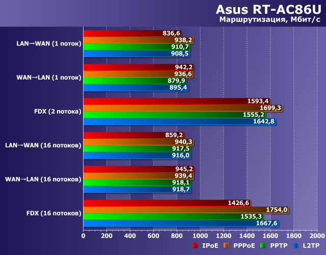 Учитывая мощную аппаратную платформу, проблем в основном сценарии маршрутизации трафика мы не ждали. Тесты подтвердили, что роутер способен обеспечить практически гигабитные скорости во всех режимах подключения.