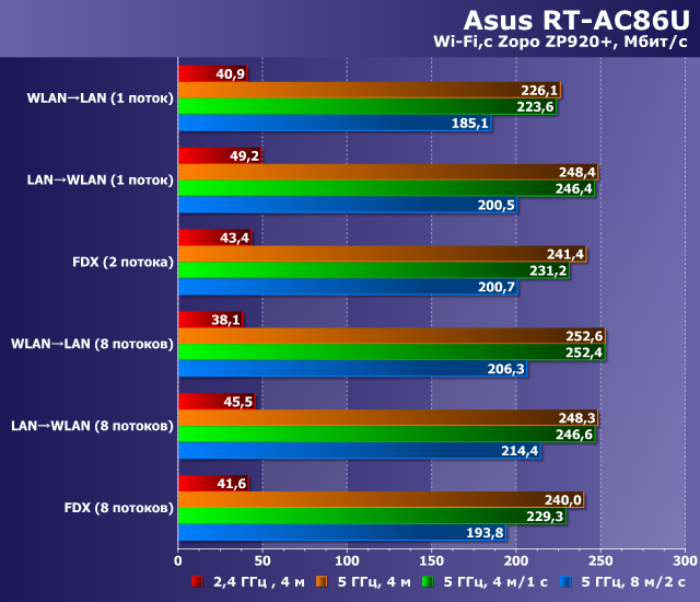 Результаты демонстрируют уверенную работу на скоростях около 200 Мбит/с в диапазоне 5 ГГц во всех проверенных точках. Так что можно говорить о том, что рассматриваемый роутер действительно обеспечивает неплохое покрытие и даже такие относительно слабые клиенты, как смартфоны, будут чувствовать себя с ним комфортно не только находясь в непосредственной близости.